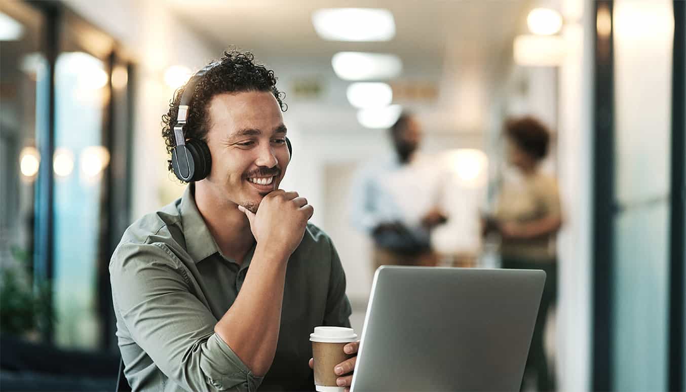 Ein Mann arbeitet im Großraumbüro, dank der Geräuschunterdrückung im Kopfhörer stört ihn die Umgebung nicht.Ein Mann arbeitet im Großraumbüro, dank der Geräuschunterdrückung im Kopfhörer stört ihn die Umgebung nicht.Ein Mann arbeitet im Großraumbüro, dank der Geräuschunterdrückung im Kopfhörer stört ihn die Umgebung nicht.