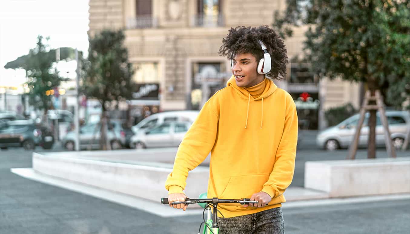 Ein Mann ist unterwegs mit dem Fahrrad in der Hand und hört Musik über seinen drahtlosen Kopfhörer.Ein Mann ist unterwegs mit dem Fahrrad in der Hand und hört Musik über seinen drahtlosen Kopfhörer.Ein Mann ist unterwegs mit dem Fahrrad in der Hand und hört Musik über seinen drahtlosen Kopfhörer.