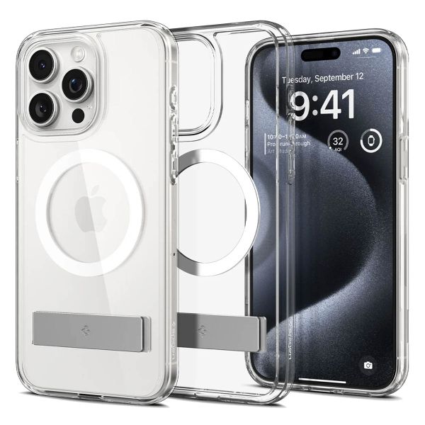 Möchtest du das elegante Design deines Handys beibehalten und trotzdem eine Hülle verwenden? Dann nimm das Ultra Hybrid S MagSafe Back Cover von Spigen! Die transparente Hülle ist aus stabilem Kunststoff gefertigt. Außerdem ist die Hülle mit stoßdämpfenden Silikonrändern versehen, die dein Handy gut schützen. Die Hülle wurde auf Stürze aus einer Höhe von bis zu 2 Metern getestet und erfüllt damit den militärischen Fallteststandard MIL-STD 810G. Zusätzlich verfügt die Hülle über einen ausklappbaren Ständer, damit du bequem Videos ansehen und deine Hände frei hast.